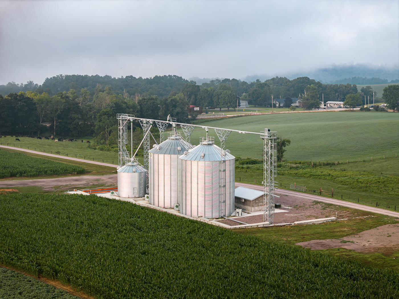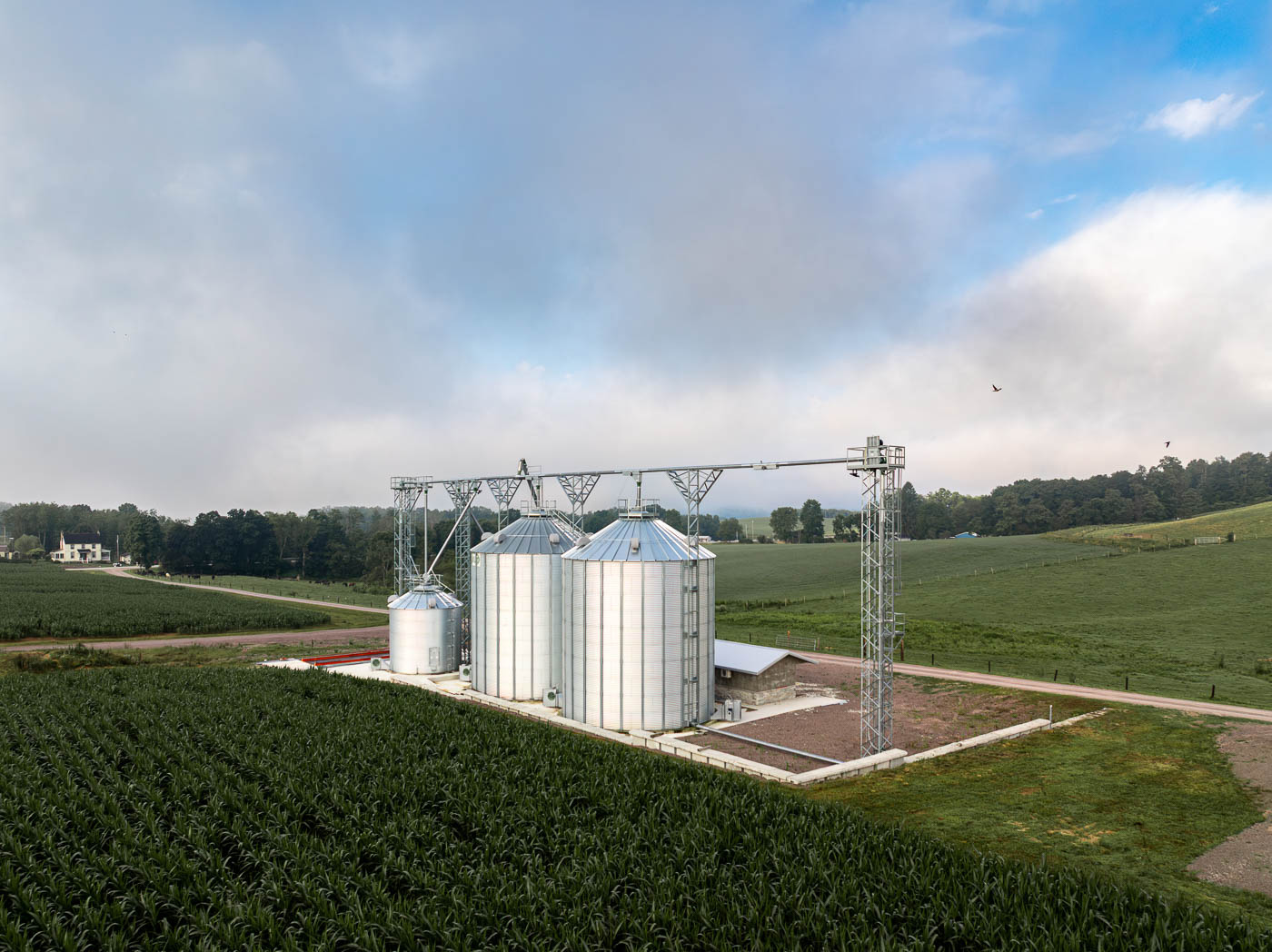 After exploring a few different concepts, they decided that a loop system would be the best fit for their goals. Starting from a mostly open site, they incorporated an existing 18' bin to serve as the wet bin and designed a system that could also handle drying grain for neighboring farms. They also planned ahead by leaving space in the loop system for a future third bin, allowing for easy expansion down the road.